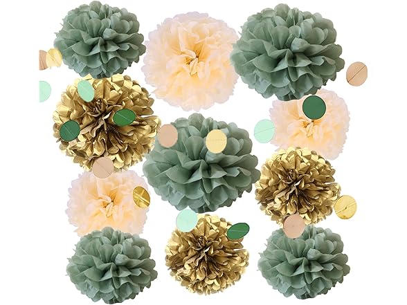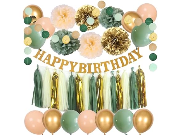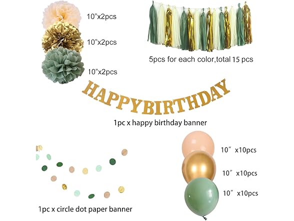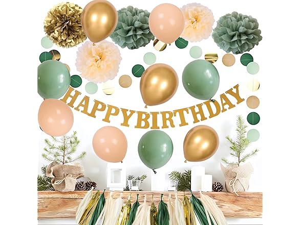 2NDTONONE 41Pcs Sage Green Gold Cream Balloon Tissue Pom Poms and Tassels Happy Birthday Banner Dots Paper Garland for Eucalyptus Greenery Rustic Neutral Safari Boho Theme Birthday Party Decor