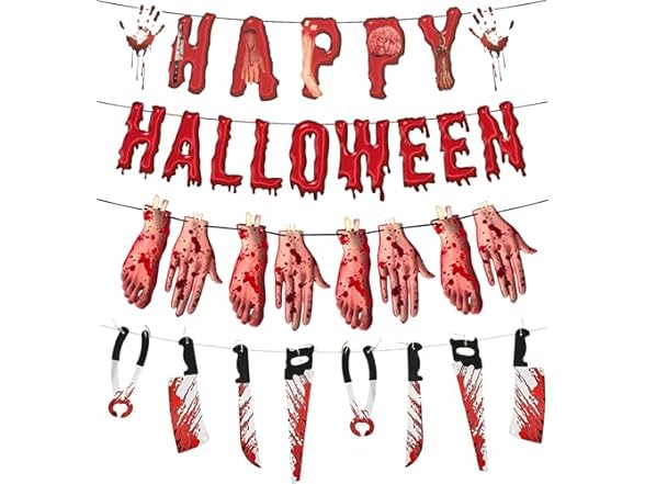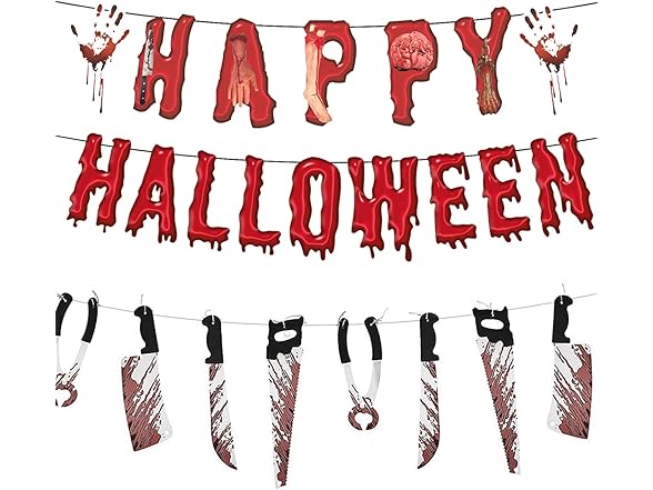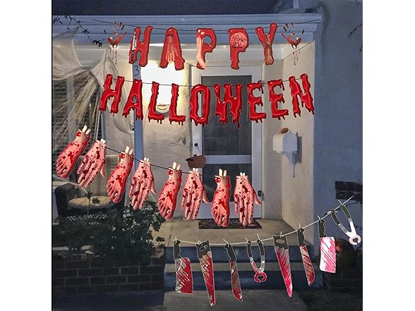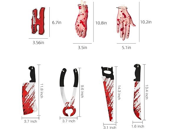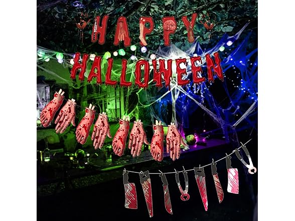 - Horror Decor Kit - contains weapons, knives, axes, hacksaw, pliers, bloody hand prints, hands, feet and HAPPY HALLOWEEN banner, these blood splattered horror props can easily turn any room into a chilling horror movie scene. Whether you want to spook your guests or create a bone-chilling backdrop for photos, bloody banners will bring an extra dose of terror to your Halloween party.