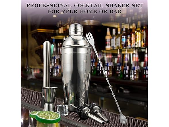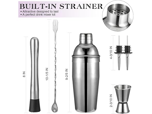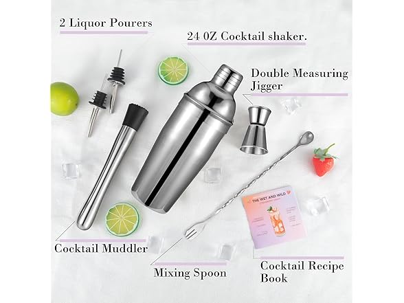 - 【 6-piece Cocktail Shaker Set】 This mixology bartender kit is all you need to craft the perfect cocktail. Designed for those who love the art of mixology, this cocktail kit includes everything to get you started: a 24oz cocktail shaker with strainer double size 1 / 0.5 oz measuring jigger, 10 inch cocktail muddler and mixing spoon, 2 liquor pours, one cocktail recipes.