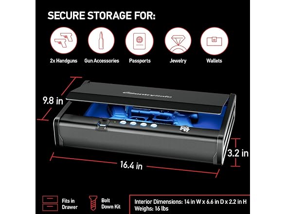 - EXTRA STORAGE SPACE: Gun safe provides secure storage for two standard handguns or one larger pistol and extra ammunition