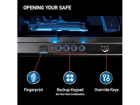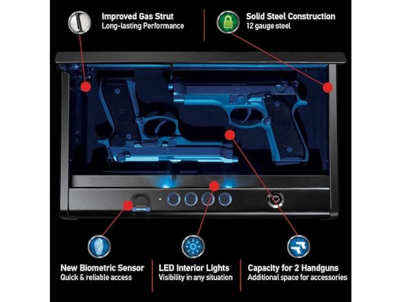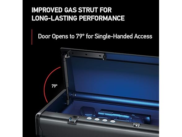 - BEDSIDE SAFE: Biometric gun safe with fingerprint scanner features a gas strut to instantly and quietly open safe door for single-handed access to your handguns, digital keypad, and override key for backup entry