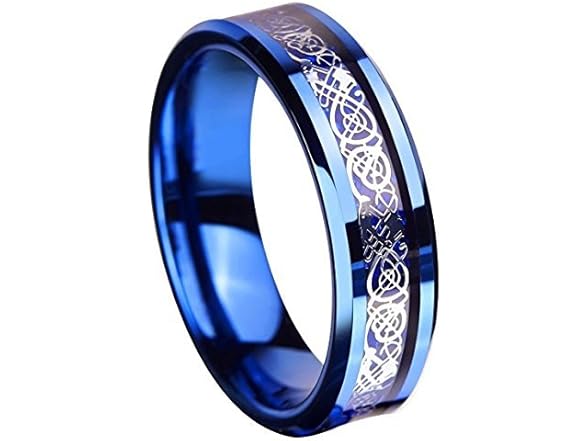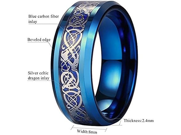 8mm Blue Black Dragon Pattern Beveled Edges Celtic Rings Jewelry Wedding Band For Men Material: Titanium steel; Package included:1pcs. How to maintain the Titanium Steel jewelry? 1. Frequently wipe the surface with a soft cloth; 2.Avoid the violent collision; 3.Avoid the sun prolonged exposure; 4.Long time not using, please place it in a cool, dry, soft jewelry box. Buy once and have it all your life. Tungsten carbide high polish rings and Celtic style rings are the newest trends in wedding bands. Tungsten is a very hard and dense metal with hardness between 8.5 and 9.5 on the Mohs hardness scale (Diamonds are a 10 - the highest). Its density, similar to that of gold, allows tungsten to be used in jewelry as an alternative to gold or platinum. Tungsten s about 10 times harder than 18K Gold, 4 times harder than titanium, 6 times as hard as steel, and is the only rare and exotic metal that can be permanently polished. Ladies and mens Celtic wedding band is a beautiful way to celebrate your love.