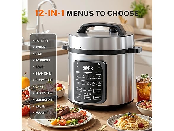 - Versatile 14-in-1 Functionality: This electric pressure cooker is your all-in-one kitchen solution. With 14 preset cooking functions, it combines the capabilities of a rice cooker, slow cooker, steamer, sauté pan, yogurt maker, and more. Whether you’re preparing hearty stews, fluffy rice, or creamy yogurt, this appliance handles it all effortlessly
