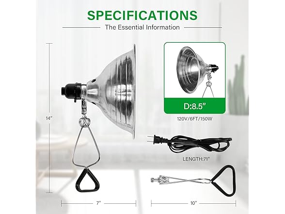 - Specifications: 8.5-inch adjustable aluminum reflector could focus positioning the light direction you need. A convenient on/off button and a 6 ft long cord for you mounting the metal clamp lamp.