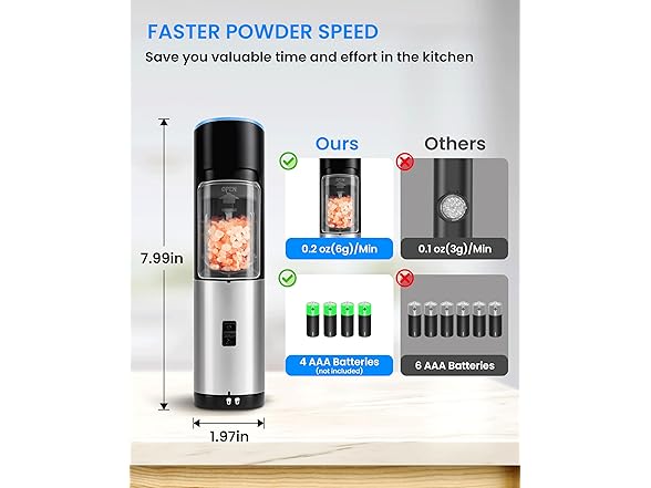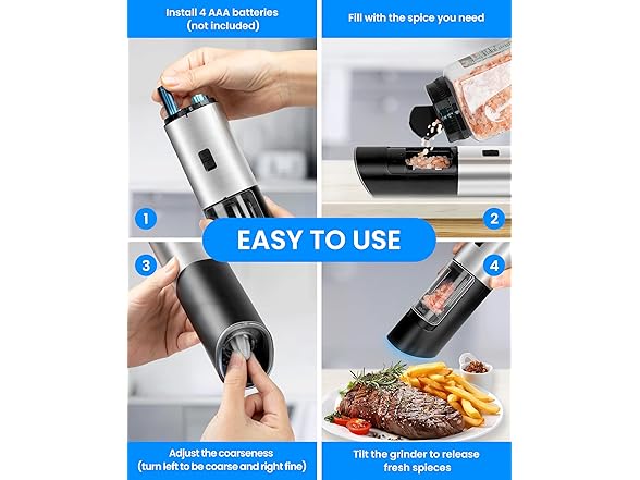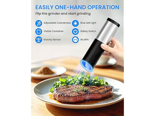 - 【Gravity Sensor Design & Battery Operated】 Electric salt and pepper grinder set adopts gravity induction design, requires 4x AAA batteries (not included). Just simply flipped the grinder with one hand and you will get fresh spices. Easy to use.