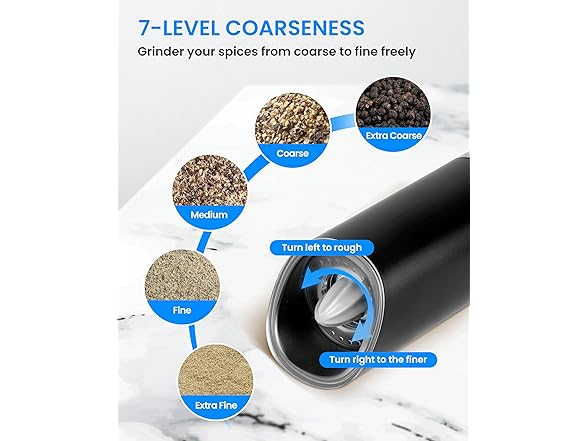 - 【Adjustable Coarseness】 Turn the grinder knob at the top part of the pepper mill to adjust the roughness according to your needed. Rotate clockwise into fine particles and rotate counterclockwise to grind into coarse particles. Good kitchen gadgets.