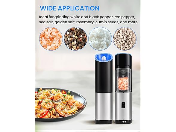 - 【Beautiful & Practical】 Gravity electric salt and pepper grinder set battery operated with blue LED light, you can easily not only see amount of salt and pepper you put in your food, but aslo see the storage area clearly. Accurately season your food.
