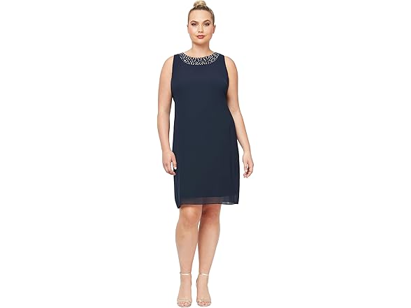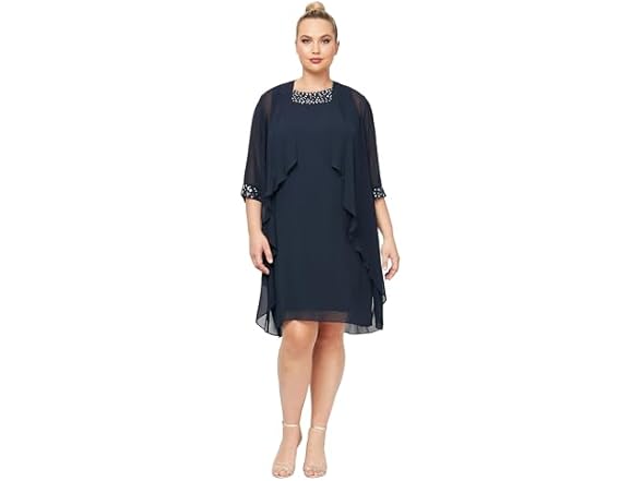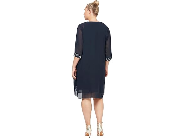 S.L. Fashions Women's Plus Size Chiffon Tier Jacket Dress with Beading Detail, Deep Navy, 14W