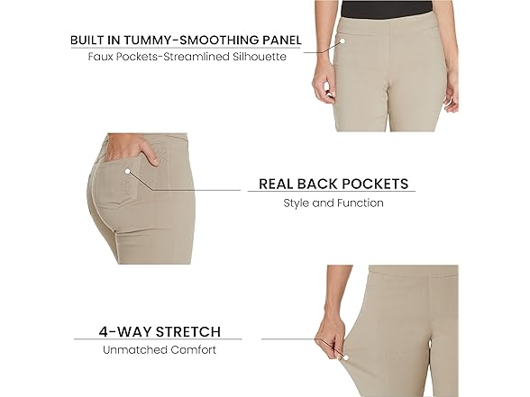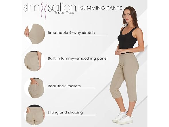 Look and feel great with SLIM-SATION. If you think it isn't possible to look fabulous and feel comfortable at the same time, think again. SLIM-SATION offers you comfortable slimming styles with a flexible tummy control panel, making you feel 10 pounds lighter in seconds. The secret is our flexible tummy control panel found in every SLIM-SATION item and our new stretch technology fabric with performance characteristics of 4-way stretch, fiber recovery and ultra-comfort. There's no need for a constricting, uncomfortable control undergarment. Each pair of SLIM-SATION pants works to contour your waist, slim your tummy, and shape your hips, all while keeping you comfy and making your figure look great throughout the day, whether you're working, playing, or running errands. You don't quit, and the SLIM-SATION tummy control panel won't quit either. With styles for every occasion, you can look and feel great, wherever you're going and whatever you're doing. The tummy control panel works the same way in both casual and formal styles. The SLIM-SATION line features colors, cuts, and styles that will suit any woman's personal look. The variety of styles means you can always look your best, from fun capris that are ideal for a fun summer weekend to relaxed pants that are perfect for the office. SLIM-SATION is already a favorite among women who want to both look and feel great. SLIM-SATION's secret slimming panel can't be seen, but the effects of it are unmissable. The panel is built into the fashion-friendly pants, giving you an on trend look and a great figure all in one. The only way to truly understand how fantastic you can look and how comfortable you can be is to try SLIM-SATION's pants for yourself. You won't be disappointed