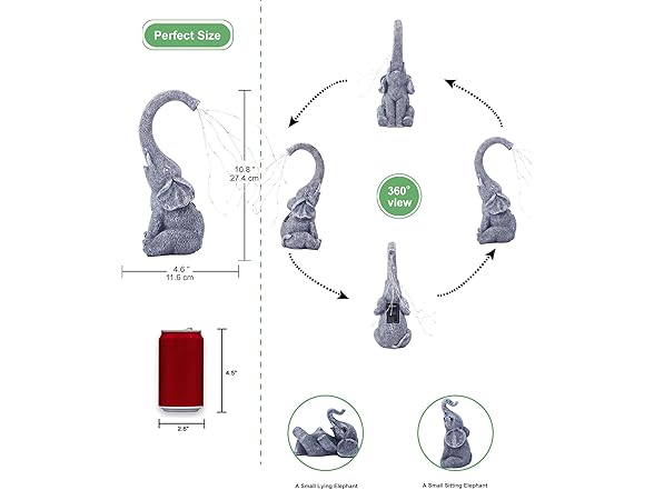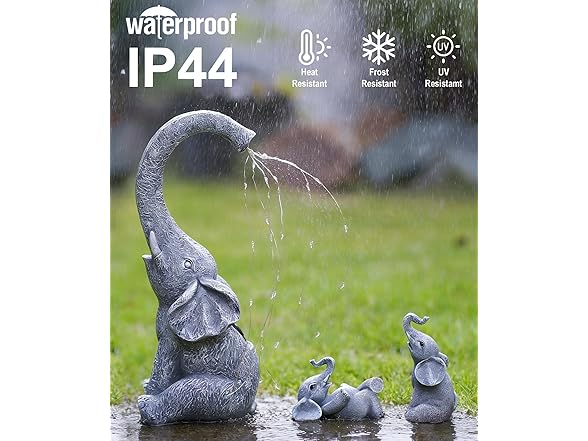 - Solar Elephant Statues feature IP44 waterproof and windproof design with UV-resistant resin; withstands harsh outdoor weather conditions; solar-powered with auto on/off function saves over 30 hours of manual operation annually.