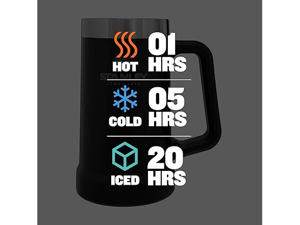 - KEEP IT NICE and COLD: From the first gulp to the last sip, the Stanley insulated beer stein keeps your brew refreshingly chilled. The secret behind the thirst-quenching thermal insulation. Vacuum insulated double walls that keep drinks hot for up to 1 hour, cold for up to 5 hours, and chilled for a whopping 20 hours. And with a large capacity of 24oz, you’ll have the power to empty 2 cans at a time and cut down trips to the beer cooler or fridge in the kitchen.