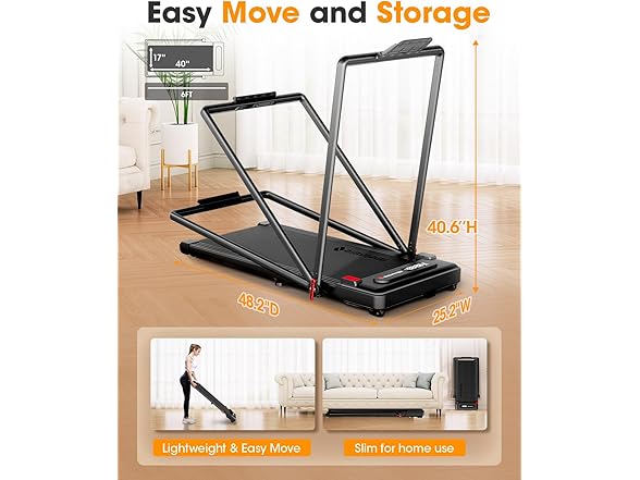 - 【Installation-free & Space Saving】 The compact and foldable walking pad requires no assembly and is ready to use right out of the box. Plus, with the super space-saving design, the desk treadmill weighs only 49lbs and has a small folded size of only 48.2"L*25.2"W*4.6"H, making it easy to store in tight corners for home, office or apartment. The built-in wheels make the foldable treadmill easily lift and moved