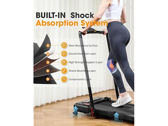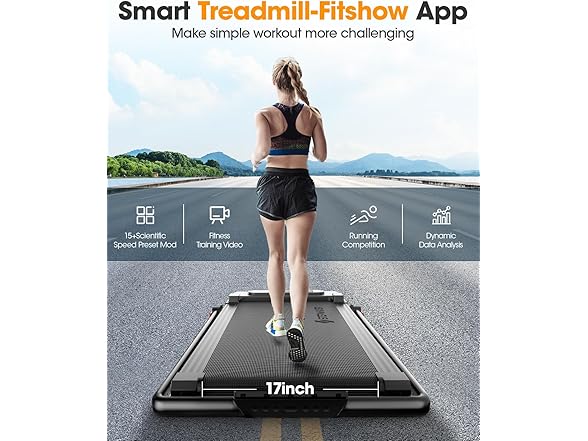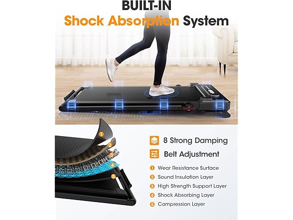 - 【Wider Runing Area & Shock Absorption System】The under desk treadmill with wider 17"*41" spacious running area. It is equipped with 5-layer of anti-slip belt, 8 silicone shock absorb and 6 soft cushions. Not only it effectively reduces joint impact and protects knees and muscles. but also provide a superior running experience. The diamond texture running belt on walking pad treadmill is designed to maintain its anti-slip and wear-resistant properties even during high-frequency workouts