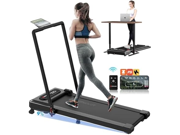 - 【Foldable Treadmill】It can be used as a under desk treadmill at the speed of 0.6-4MPH when the handle is placed down, and it is suit for walking and doing some work under a stand up desk. Also it can be used as a treadmill at the speed of 0.6-7.6MPH when the handle is placed up(40.6”) and it is able to running and hit the fitness goal in regardless of the elements outside