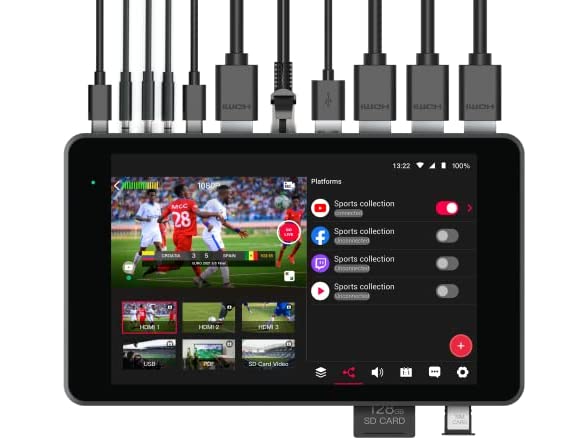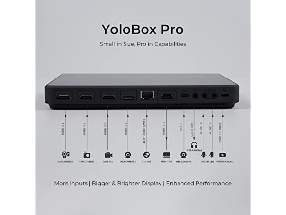 - 【More Inputs & Capabilities】 YoloBox Pro has 3 HDMI inputs, 1 USB input, 1 Full Featured USBC input, plus local SD card video sources and PDF source from SD card, 1 Mic in, 1 Line in, 1 HDMI out, 1 Audio out. It can live switch up to a total of 8 sources. YoloBox Pro works perfectly with Blackmagic ATEM Mini series and other switchers, Rode microphones and Wireless Transmitters. The Enhanced CPU opens the door to expanded capabilities of upcoming software features to make it more powerful.