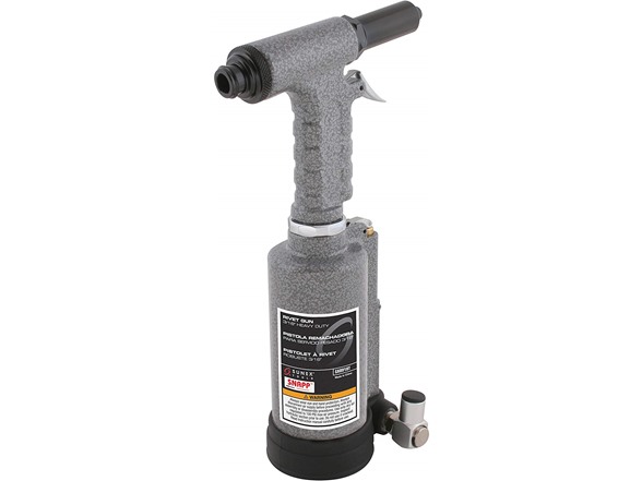Sunex's 3/16-inch heavy duty rivet gun features a pulling power of 1,983 ft-lbs and a forged aluminum handle, and sets all conventional, standard, and structural blind rivets, monobolts, and t-rivets up to and including 3/16-inch diameter in all materials. The gun comes with nose pieces in 3/32-inch, 1/8-inch, 5/32-inch, and 3/16-inch sizes, which can be stored conveniently underneath the base of the gun.