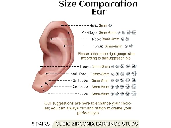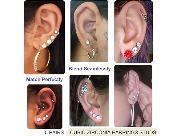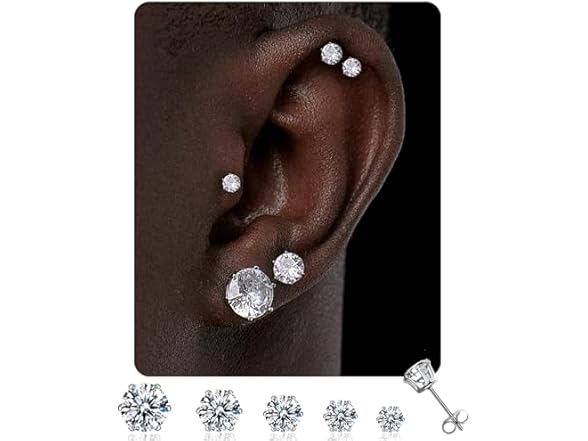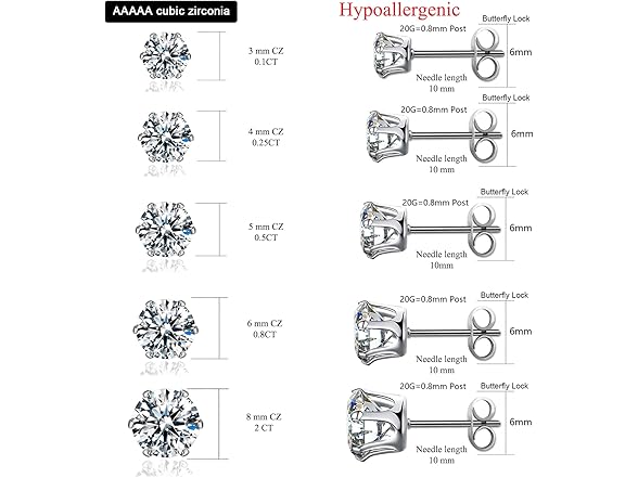 Cubic Zirconia Earrings Studs For Women Men 5 Pairs 3/4/5/6/8mm Silver Simulated Diamond Round Hypoallergenic Surgical Steel Stud Earrings For Women Men
