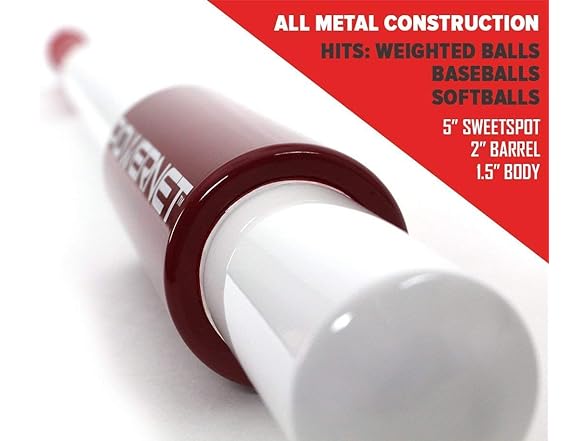 - IMPROVED HAND-EYE COORDINATION; Learn to hit on the sweet spot with any game or weighted ball; Available in 3 length/weight combinations (27" / 24 oz, 31" / 28 oz, 34" / 32 oz) 2 diameter by 5 red wide sweet spot area on a slim 1.5 white barrel