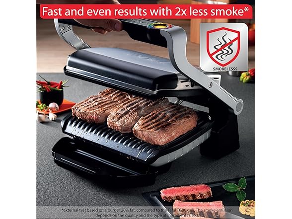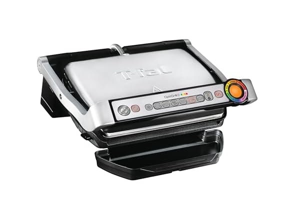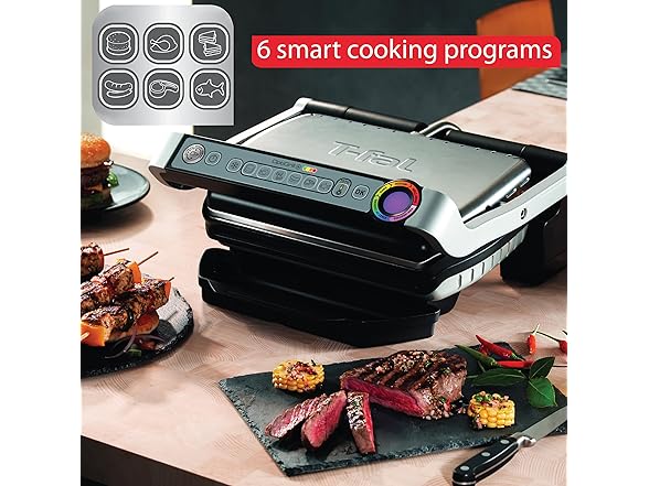 Elevate your indoor grilling experience with the T-fal OptiGrill XL Electric Indoor Grill, an indoor grill with removable plates designed for restaurant-quality results at home. Featuring advanced Smart Sensor Technology, the innovative electric grills automatically measure food thickness and adjusts cooking time and temperature, ensuring perfect doneness from rare to well-done. With six automatic cooking programs, this countertop grill simplifies grilling. Select the appropriate program for burgers, poultry, fish, sandwiches, and more, and let the grill do the work. Intelligent sensors adapt to various food types, guaranteeing consistent, delicious results. This multi-functional portable grill serves as a panini press grill, griddle, and traditional grill, opening up a world of culinary possibilities. From gourmet sandwiches to perfectly seared steaks and crispy vegetables, the OptiGrill XL is an indispensable kitchen tool. Health-conscious cooks will appreciate the grill's ability to reduce fat content in meals. Inclined plates and an integrated juice tray remove up to 44% of fat from your food (based on a 20% fat burger), allowing you to enjoy flavorful, grilled meals with less guilt. Convenience is key with the OptiGrill XL's nonstick, removable plates and juice tray, all designed for easy cleaning. The generous cooking surface accommodates 4-8 servings, perfect for family meals or entertaining. Its sleek stainless steel exterior ensures durability and complements any kitchen decor and kitchen appliances. Safety features include cool-touch handles and an automatic shut-off function. The grill comes with a recipe book to inspire your culinary creativity and help you make the most of its versatile features. Experience precision grilling and unlock your culinary potential with this innovative indoor grill.
