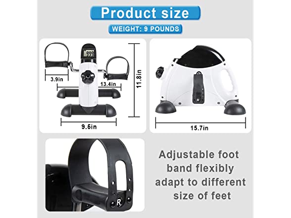 - The low-profile design prevents the mini exercise bike from swinging and sliding when in use. Sturdy frame and non-slip feet for safety and efficient. Each pedal also has a non-slip surface, with molded finger grips and an adjustable four-hole straps for added comfort and safety.
