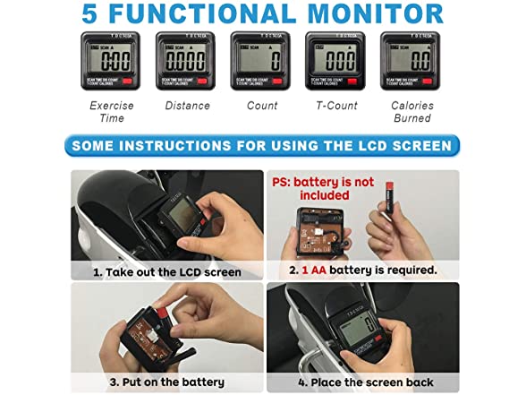 - The multi-function LCD monitor can display time, distance, total count and calories through the buttons in use. Helps increase strength, improve coordination and circulation. Large and easy-to-read display can keep track of your workout progress easily and allow you to read all data clearly.
