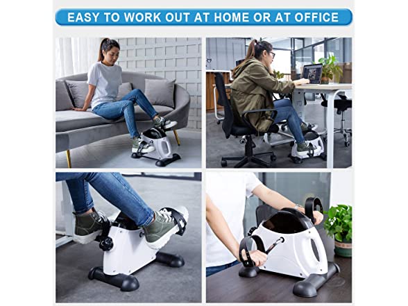 - Compact pedal exerciser can be used to strengthen arms and legs, improve focus and concentration for a more productive day. Quiet and smooth pedal operation makes the under desk bike available in office and home. Watching TV and playing games while exercising can bring you a relaxing and enjoyable exercise experience.