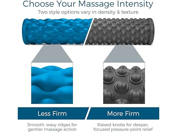 - CHOOSE YOUR INTENSITY: The blue roller is the gentler option, designed with subtle "wavy" ridges and slightly less firm foam wrapping. The gray roller is more firm, with a "bumpy" design that mimics fingertips for deeper, more focused pressure-point relief.