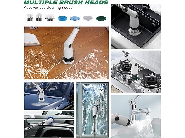 - 7 Different Brushes, Great for Nooks and Crannies: Discover the exceptional versatility of the TEMINO Shower Spin Scrubber. Large flat brushes for showers and floors; small flat brushes for detail work; corner brushes for baseboards, door frames, and tiles with deep grout. Sponge brush for car window glass cleaning; scouring pad for the kitchen. Each brush can get deep into the corner to remove grout and stains effectively.