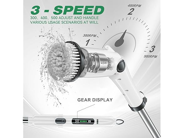 - Three Spin Speed, Save Time and Effort: Unlike other electric spin scrubbers that only have one speed and the power is limited; Electric Spin Scrubber has 3 adjustable spin speeds, cleaning soap scum, grout, or stubborn stains in a few minutes. Long Press and turn the power on, then press the ON/OFF button to switch the spin speed, 1 speed of 300 RPM mode for the daily clean, 2 speed of 400 RPM mode for deep cleaning, 3 speed of 500 RPM mode for powerful cleaning.