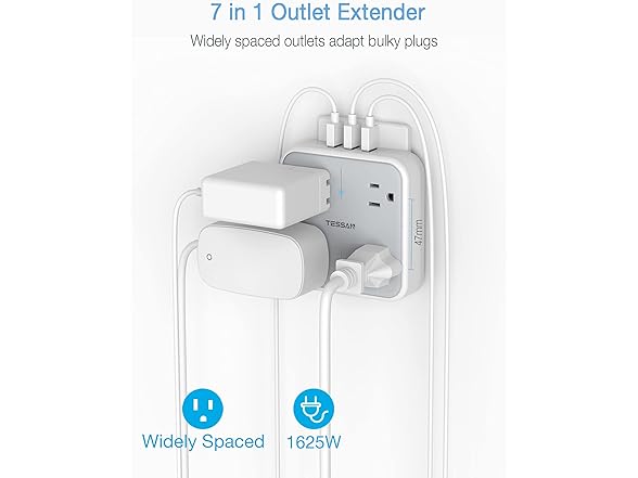 - Widely Space AC Outlets: The multi plug wall outlet could turn 2 sockets into 4 electrical outlets; Widely Spaced outlet could fit 4 bulky plugs at the same time without blocking each other