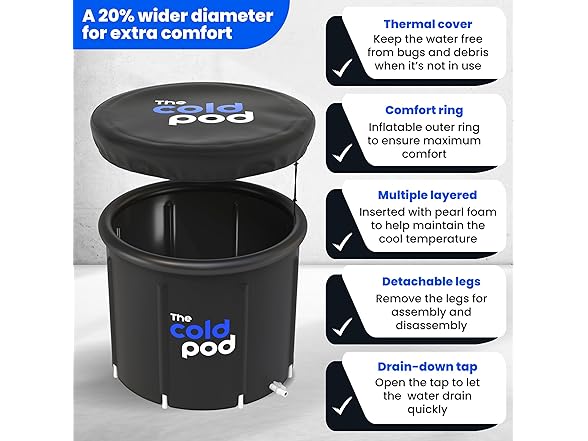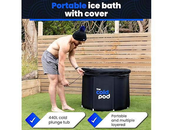 - IMMERSE, COVER, REPEAT - Reap the benefits of cold water immersion from the comfort of home with The Cold Pod portable ice bath tub with cover. Designed for both indoor and outdoor use, this multiple layered cold plunge tub comes complete with a cover, so you can immerse, cover, and repeat anytime and anywhere