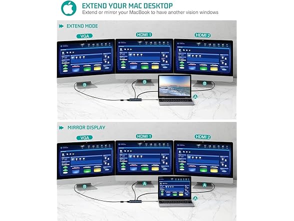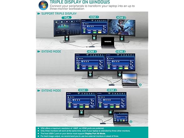 - Triple Display: The docking station supports triple 4K display via 2 HDMI ports and 1 VGA port, easily connecting your laptop to three screens at the same time, greatly improving your work efficiency.