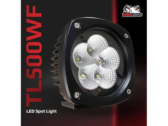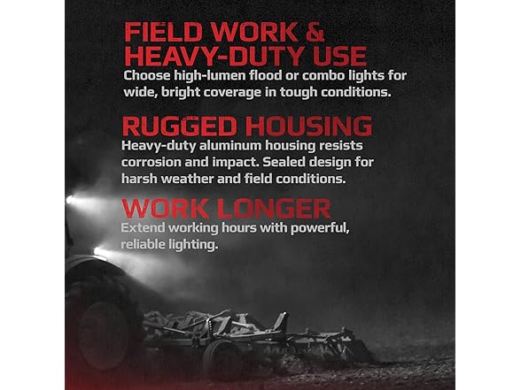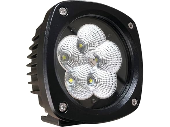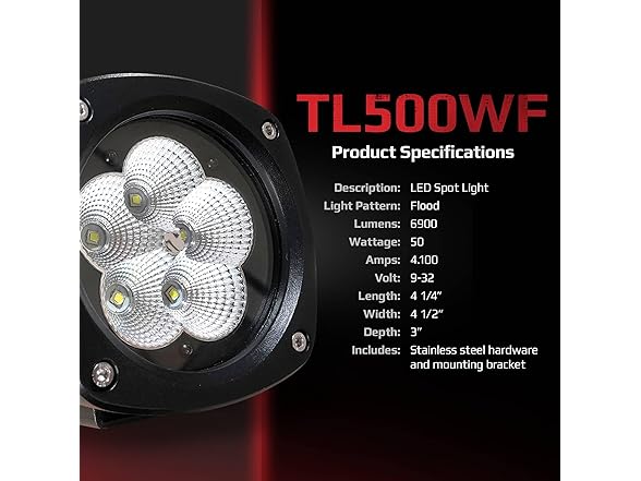 - Specs: LED Tractor Headlight, Light Pattern: Flood, Lumens: 6900, Wattage: 50, Amps: 4.1, Volt: 9-32, Warranty: Limited Lifetime , 90° flood pattern, Includes: Stainless steel hardware and mounting bracket, Length: 4 1/4, Width: 4 1/2, Depth: 3