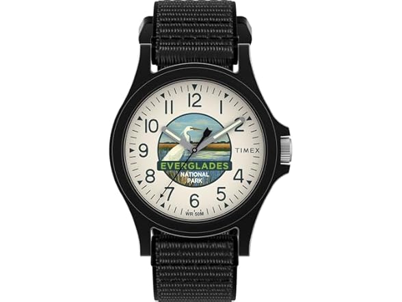 - Collect Them All: The Timex x National Parks collection is a tribute to America’s wild spaces. This watch captures the vibrant energy and unique landscape of Everglades National Park with a nostalgic dial illustration reminiscent of a vintage postcard. Look for other iconic park designs to complete the collection