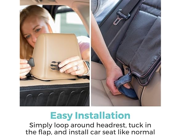 - EASY TO INSTALL - Installing this car seat protector for child car seats is quick and easy. Simply clip the adjustable buckles around the headrest posts and tuck in the flap for a snug and stable fit.