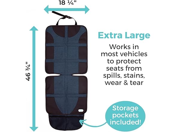 - UNIVERSAL FIT - Our extra-large baby car seat protector works in most vehicles to protect seats from spills, stains, wear, and tear. The car seat mat can be used with leather or fabric seats. It also has two mesh storage pockets for easy access.