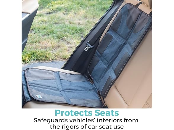 About the Car Seat Protector: Our extra-large baby car seat protector works in most vehicles to protect seats from spills, stains, wear, and tear. The car seat mat can be used with leather or fabric seats. It also has two mesh storage pockets for easy access. Whether you have a forward or rear-facing car seat, this child car seat protector provides comprehensive coverage and peace of mind. Equipped with slip-resistant backing and a tuck-in flap, the seat protector stays securely in place, preventing any shifting during drives. The backing of the seat protector prevents bleeding color onto vehicle seats' material. Installing this car seat protector for child car seats is quick and easy. Simply clip the adjustable buckles around the headrest posts and tuck in the flap for a snug and stable fit. Crafted from a durable denim-like fabric, the under car seat protector is both robust and easy to maintain. This seat cover for carseats can be wiped clean with a damp cloth, making it ideal for everyday use. About Toddleroo by North States: We pride ourselves on U.S. manufacturing because it allows us to maintain the highest standard of quality control. Since 1953, our products have been built by skilled craftsmen and women who are dedicated to making the finest products in America. Our innovative, superior-quality products are designed to achieve the highest standards in safety, durability, and ease of use. You’ll always find us ahead of the curve and on the cutting edge of the industry. It can be used with leather or fabric seats. Whether you have a forward or rear-facing car seat, this LATCH system compatible car seat protector for car seats provides comprehensive coverage and peace of mind. Its slip-resistant backing and tuck-in flap ensure that it stays securely in place, preventing any unwanted shifting during drives. Installation is a breeze, with clips that wrap around headrest posts and a tuck-in flap for a snug and stable fit. For added convenience, the Car Seat Protector for child car seat includes two mesh storage pockets, perfect for keeping small items like kids' toys, toddler snacks, or diaper & cleaning wipes within easy reach. Crafted from a durable denim-like fabric, this seat protector for under car seats is not only robust and long-lasting but also color-safe and easy to clean, maintaining its appearance and functionality over time. To clean, simply wipe with a clean, damp cloth. With the Car Seat Protector, parents can enjoy a cleaner, more organized vehicle, free from the worry of spills and stains, making every journey smoother and more enjoyable. Ready. Set. Go!