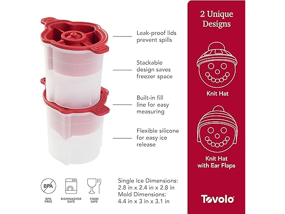 Bring the magic of a winter wonderland to your beverages with these charming Snowman Ice Molds sporting cozy knitted caps. Each sphere captures the essence of a snowy day, complete with snowmen bundled up in their winter best. These knitted hat snowman ice spheres are conversation starters that transform ordinary drinks into memorable moments. Beyond their adorable appearance, these knitted hat snowman ice cube molds deliver serious functionality. Large ice spheres melt slowly maintaining optimal drink temperature while preserving cocktail integrity. The innovative design includes precision fill lines overflow vents, and secure lids that work together for foolproof results every time. Perfect for anyone who loves adding thoughtful touches to entertaining these ice cube snowman molds make exceptional gifts. The space saving stackable design fits neatly in crowded freezers, while odor blocking seals keep ice fresh. Made from food safe, BPA free silicone that's dishwasher safe, they combine Tovolo's playful innovation with practical durability for endless winter celebrations.