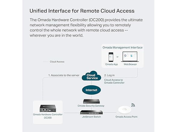 - Cloud Access with No License Fee-Enjoy cloud service with no license fee with the use of OC200. Remote Cloud access and Omada app brings centralized cloud management of the whole network from different sites—all controlled from a single interface anywhere, anytime.