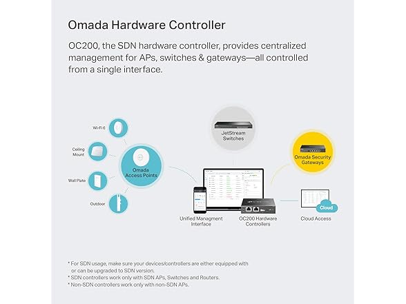 - SDN Compatibility-For SDN usage, make sure your devices/controllers are either equipped with or can be upgraded to SDN version. OC200 work only with SDN access points, switches & gateways. For devices that are compatible with SDN firmware, please visit TP-Link website.