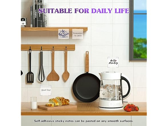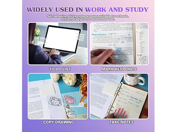 - WIDE APPLICATIONS-Self-adhesive sticky notes are very suitable for schools, offices, study rooms and homes use. It can be pasted on books,notes,bible,doors,walls, desks, refrigerator,whiteboards, computers,diaries, documents,bathroom mirrors, and any other smooth surfaces.