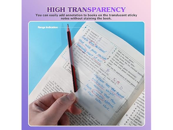 HIGH TRANSPARENCY-Highly transparent sticky notes that allow you to clearly see the original book without being obstructed,which has tracing paper feature that can help you