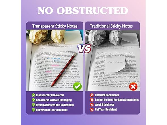 - NO OBSTRUCTED-Compared with traditional sticky notes, the transparent sticky notes will not block the original documents, you can easily add annotation to books and documents on the translucent sticky notes without staining the book.