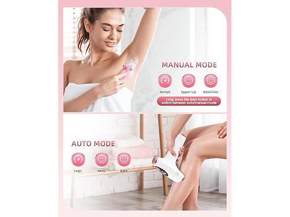 - MANUAL & AUTO MODE -- Easy to use even for beginners: Freely switch to auto or manual mode by long pressing the flash button. Manual mode is mainly used for small areas, such as bikini line, armpit, lips; Auto mode can be used on large areas, such as arms, legs and back.
