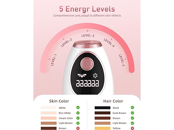 - 5 Power Levels & Ergonomic Design: The Laser permanent hair removal device for women/men offers - simply press the On/Off button to adjust to the Power Level that best suits your skin (start from Power Level 1 and work your way up as needed).