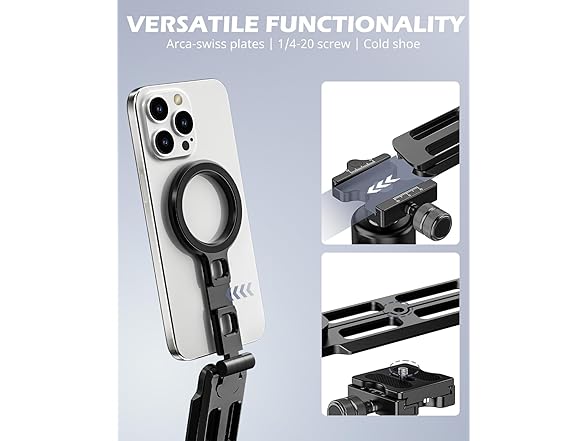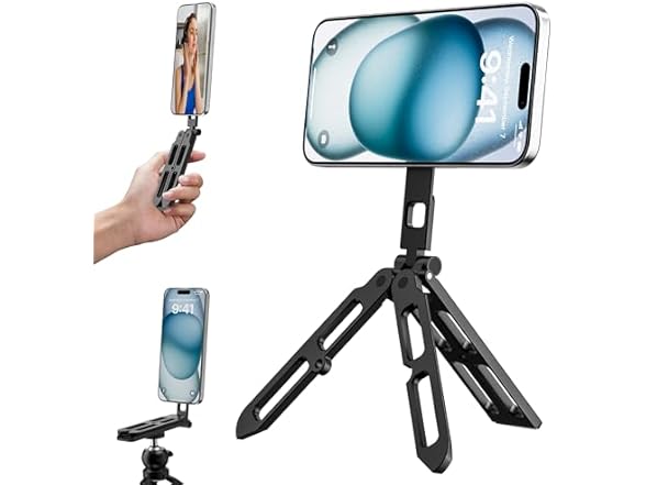 - 【2-in-1 Magnetic Tripod & Universal Mount Adapter】Not just a mini phone stand — this foldable tripod doubles as a MagSafe-compatible phone holder for all standard tripods, gimbals, and selfie sticks with a 1/4" screw. Use it as a desktop stand or mount it for pro-level stability and cinematic shots