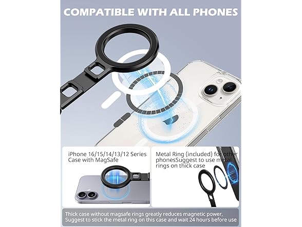 - 【Strong MagSafe Lock & Universal Compatibility】Built-in powerful magnet locks securely onto iPhone 16/15/14/13/12 series with MagSafe. Includes a metal ring for Android or non-MagSafe phones — ensuring firm hold even with thicker cases