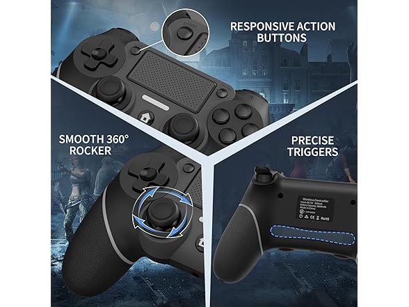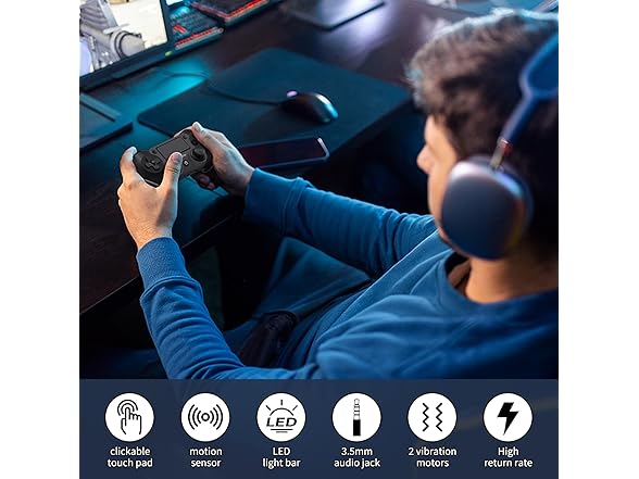 - Product Detail: The ps4 controller wireless uses high performance Bluetooth technology for 33ft control distance.1000mAh rechargeable battery takes 2-4 hours to fully charge for 15-20 hours of playing. Include clickable touch pad, motion sensor, LED light bar, 3.5mm audio jack, built-in speaker, Type c charging cable.