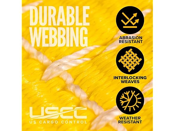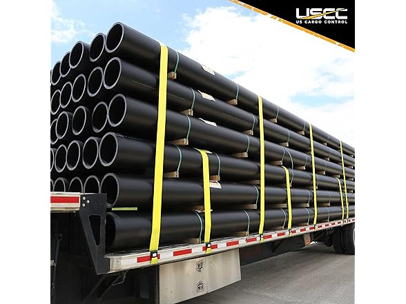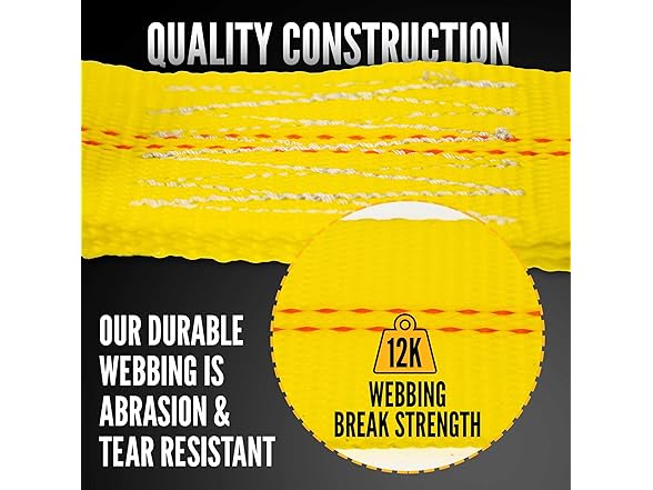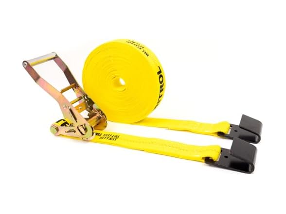 - 3:1 DESIGN FACTOR - The flatbed tie downs feature 2" wide yellow polyester webbing that measures 50 ft. long and boasts an impressive 10,000 lbs break strength and 3,333 lbs. working load limit. Our heavy duty straps with hooks are tested in the USA.