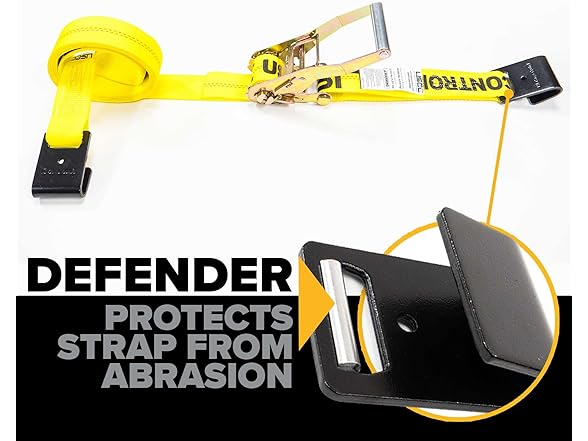 - DURABLE FLAT HOOK - Our trailer tie down straps features a wide, zinc-coated ratchet and fitted with two (2) black flat hooks that are powder-coated for added protection. Each flat hook contains a defender to protect webbing from abrasions and wear.